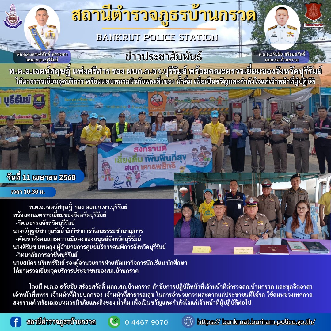 พ.ต.อ.เจตน์สฤษฎิ์ แพ่งศรีสาร รอง ผบก.ภ.จว.บุรีรัมย์ พร้อมคณะ ตรวจเยี่ยมจุดบริการประชาชนช่วงเทศกาลวันสงกรานต์2568
